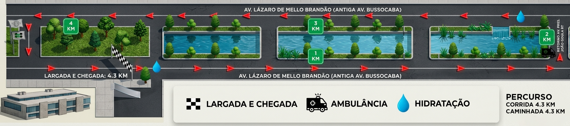 Largada (Corrida e Caminhada de 4.3 Km / Corrida de 8 Km): 07h.